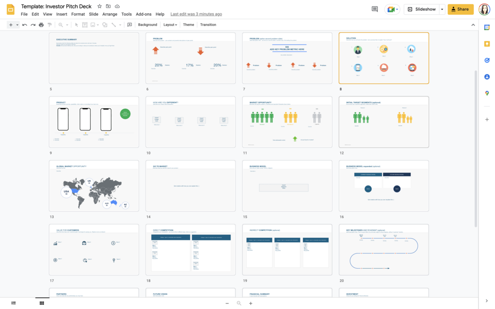 I used this Investor Pitch Deck for my startup a few years ago, to raise capital as an early stage startup. This template can be downloaded for you to create your own pitch deck, and has prompts on each slide to help you with each section.