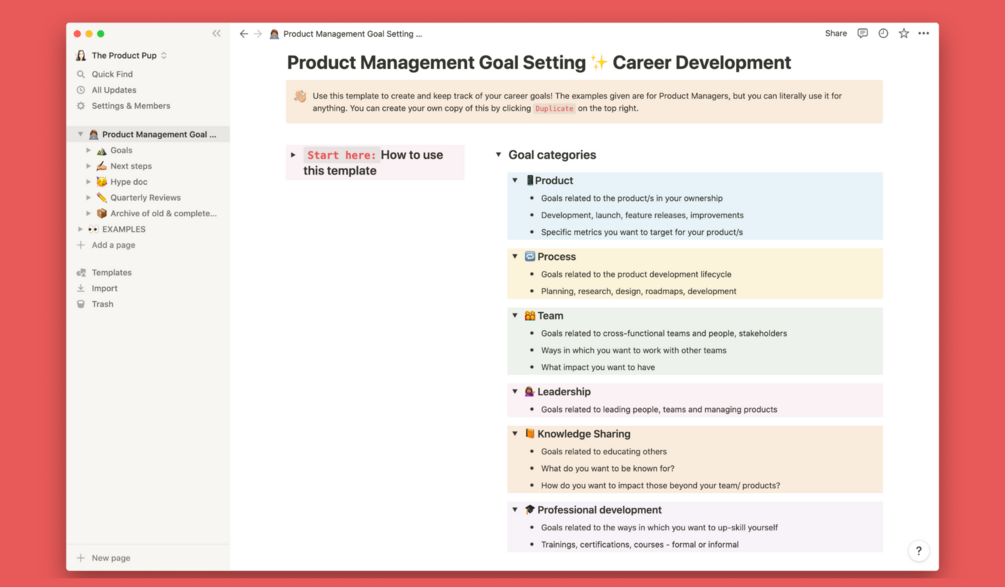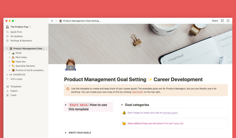 A simple Notion template to set, track and manage your career-focussed goals. Aimed at helping Product Managers, but can really be used by anyone, in any career path or industry.